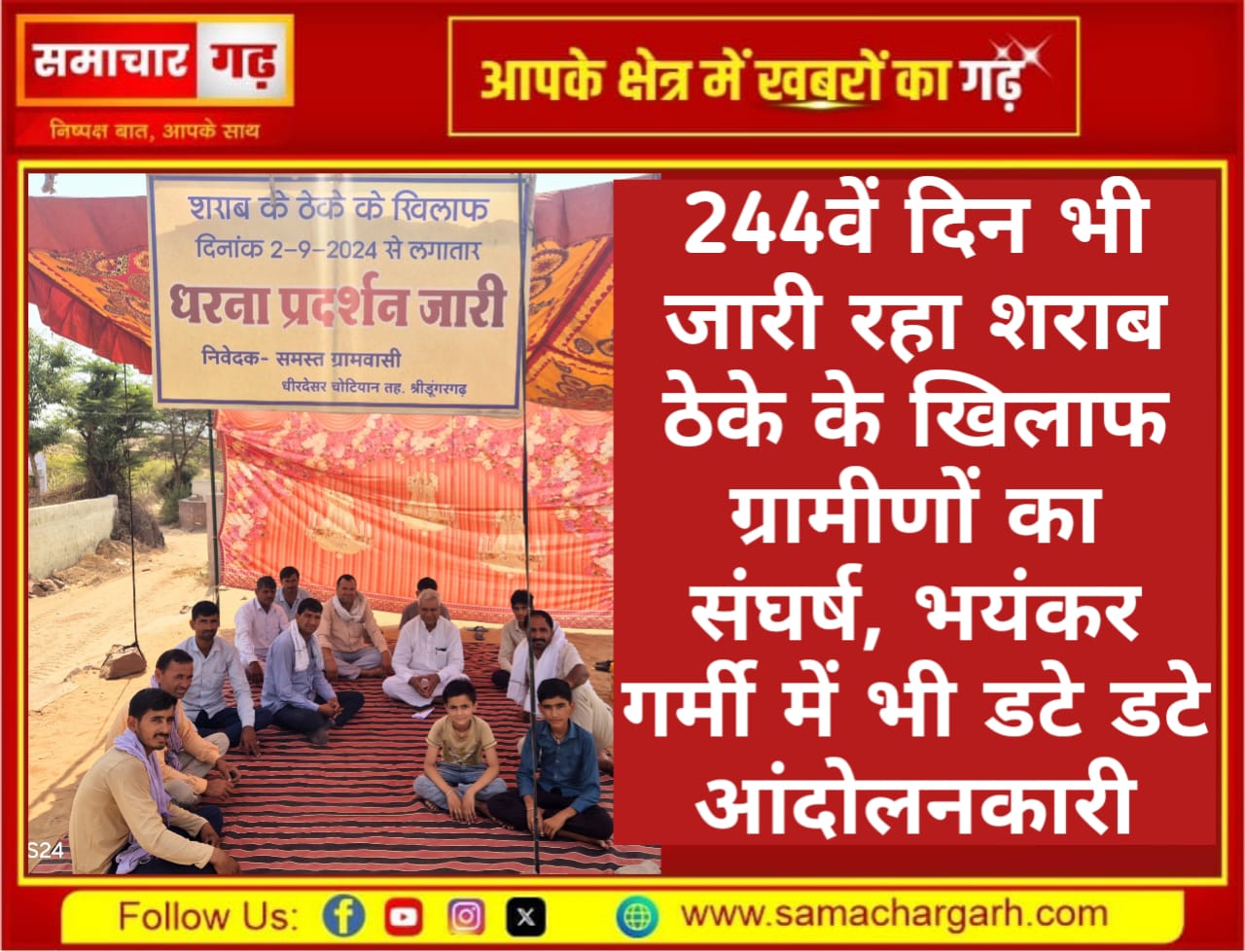 समाचार गढ़ 1 मई 2025। गांव धीरदेसर चोटियान में शराब ठेके को बंद करने की मांग को लेकर ग्रामीणों का धरना 244वें दिन भी जारी रहा। गांव के युवा, बुजुर्ग और बच्चे पिछले आठ महीने से अधिक समय से खुले मैदान में डटे हुए हैं। कड़ाके की सर्दी से लेकर अब इस भीषण गर्मी और लू के थपेड़ों के बीच भी वे अपनी मांग पर अडिग हैं।