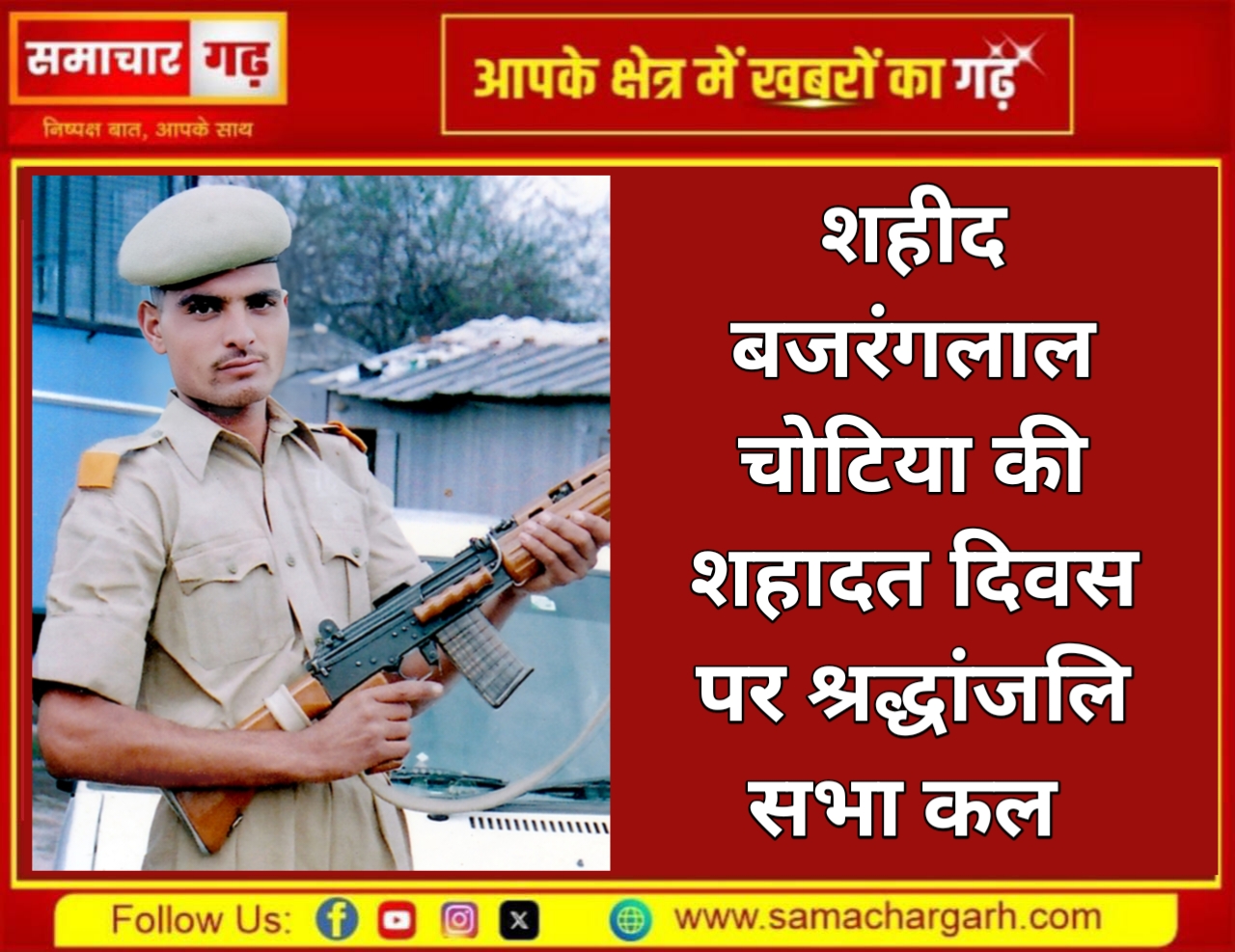 समाचार गढ़ 25 सितंबर 2025 श्रीडूंगरगढ़। वीरभूमि धीरदेसर चोटियान में शहीद नायक बजरंगलाल चोटिया की शहादत दिवस पर श्रद्धांजलि सभा का आयोजन आज 26 सितंबर को रखा गया है। यह कार्यक्रम सुबह 9 बजे शहीद नायक राकेश कुमार चोटिया राजकीय उच्च माध्यमिक विद्यालय धीरदेसर चोटियान में होगा। श्रद्धांजलि सभा में क्षेत्रवासी एकत्र होकर शहीद की स्मृति को नमन करेंगे और उनके बलिदान को याद करेंगे।