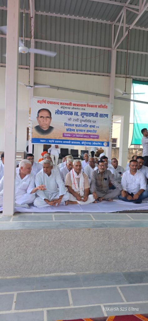 समाचार गढ़,श्रीडूंगरगढ़, 29 सितम्बर 2025 महर्षि दयानंद सरस्वती छात्रावास में रविवार को लोकनायक स्व. लूणाराम सारण की 29वीं पुण्यतिथि पर श्रद्धांजलि सभा एवं प्रतिभा सम्मान समारोह आयोजित हुआ। कार्यक्रम की अध्यक्षता एडवोकेट श्यामसुंदर आर्य ने की।