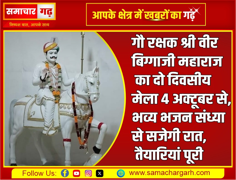 समाचार गढ़, 27 सितम्बर 2025, श्रीडूंगरगढ़। (गौरी शंकर सारस्वत सातलेरा की विशेष’ रिपोर्ट) जाखड़ समुदाय के कुल देवता गौ रक्षक वीर बिग्गाजी महाराज का दो दिवसीय मेला 4 अक्टूबर से प्रारंभ होगा। आयोजन शीश देवली धाम रीड़ी एवं शौर्यपीठ धड़ देवली धाम रोही बिग्गा में किया जाएगा।