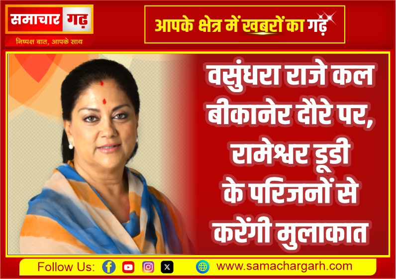 समाचार गढ़, श्रीडूंगरगढ़, 8 अक्टूबर 2025। पूर्व मुख्यमंत्री व भाजपा की राष्ट्रीय उपाध्यक्ष वसुंधरा राजे सिंधिया कल बीकानेर प्रवास पर रहेंगी। सामाजिक कार्यकर्ता नितिन नाई श्रीडूंगरगढ़ ने जानकारी दी कि राजे का यह प्रवास अल्पकालिक रहेगा। राजे का बीकानेर आगमन सुबह 11:15 बजे निर्धारित है, जहां वे एयरपोर्ट पर उतरेंगी। इसके बाद वे रोड मार्ग से दिवंगत कांग्रेस नेता रामेश्वर डूडी के निवास स्थान जाएंगी और उनके शोकाकुल परिवार को सांत्वना देंगी। कार्यक्रम के अनुसार, वसुंधरा राजे दोपहर 1:30 बजे बीकानेर से जयपुर के लिए रवाना होंगी।