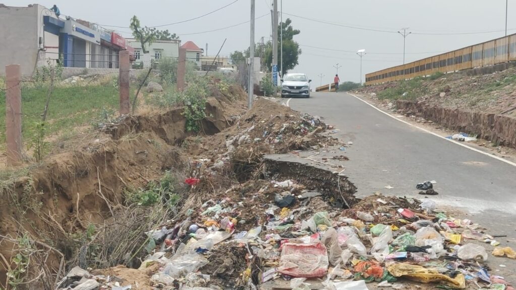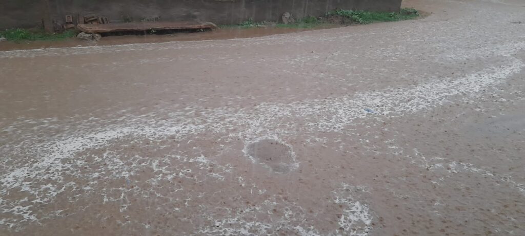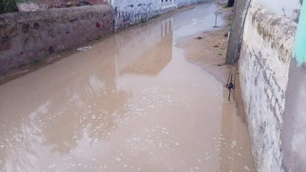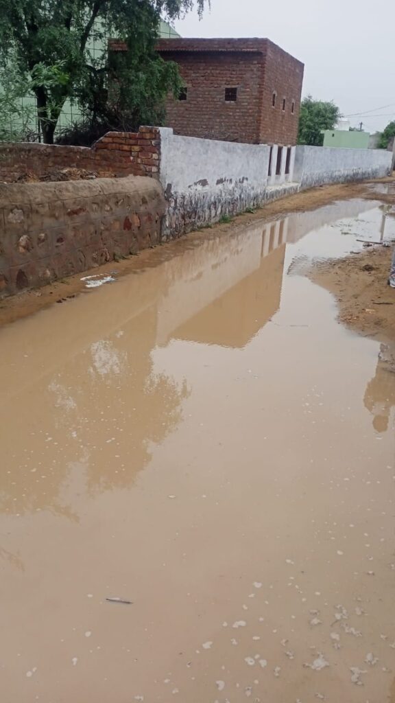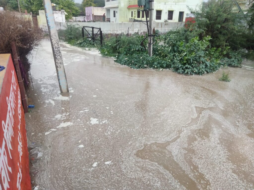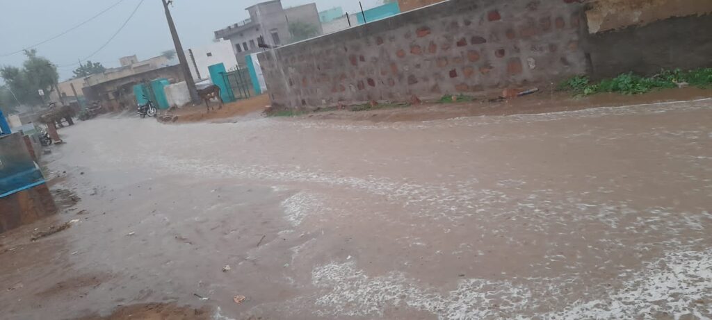 समाचार-गढ़ श्रीडूंगरगढ़। गुरुवार को अल सुबह हुई बरसात के बाद शाम को फिर से भारी बरसात से कई गांव पानी पानी हो गए। श्रीडूंगरगढ़ के धीरदेसर चोटियां, कुंतासर, बिग्गा, सातलेरा, रेवाड़ा, जैसलसर, ठुकरियासर, सहित कई गांव पानी में हो गए। भारी बरसात से गांवो मे निचले इलाकों के घरों में पानी घुस गया। गांवो मे गलियों में पानी भरने से आवागमन ठप हो गया है। किसानों ने बताया कि रिकॉर्ड बरसात से खेतो पानी भर गया। दूसरी ओर तेज बरसात से श्रीडूंगरगढ़ में हाईवे के पास बनी सर्विस रोड़ बरसात के पानी में बह गई है। यहां नेशनल हाईवे के पास मूमल होटल के पास पहली बरसात में सर्विस रोड़ टूट गई जो हाईवे निर्माण कंपनी की पोल खुल गई है। ज्यादा बरसात से पक्के रास्तों पर पानी भरने से आवागमन बाधित हो गया है।