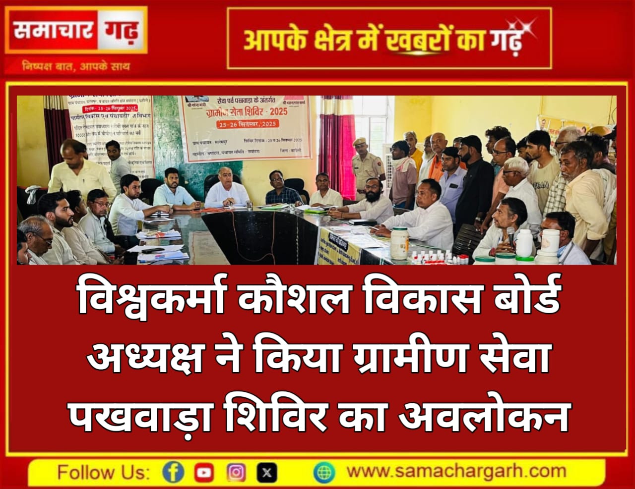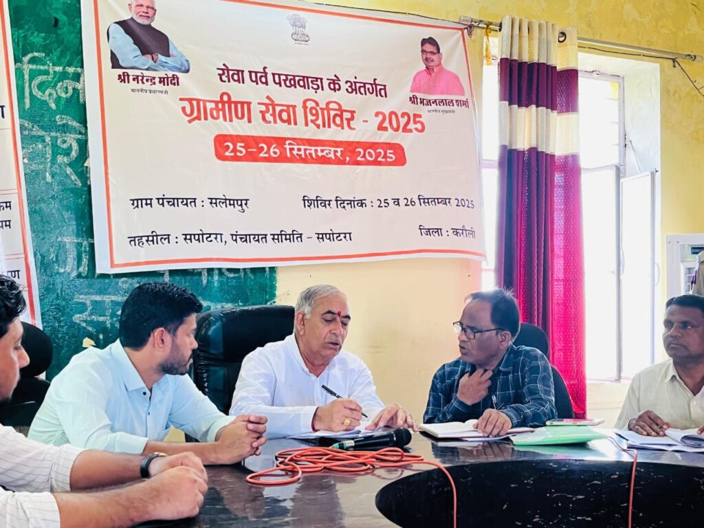 समाचार गढ़ 26 सितंबर 2025 विधानसभा क्षेत्र सपोटरा की ग्राम पंचायत सलेमपुर में शुक्रवार को आयोजित ग्रामीण सेवा पखवाड़ा शिविर का अवलोकन आज विश्वकर्मा कौशल विकास बोर्ड के अध्यक्ष रामगोपाल सुथार ने किया। उन्होंने लाभार्थियों से संवाद कर उनकी समस्याएं जानी और सरकार की जनकल्याणकारी योजनाओं की जानकारी दी।