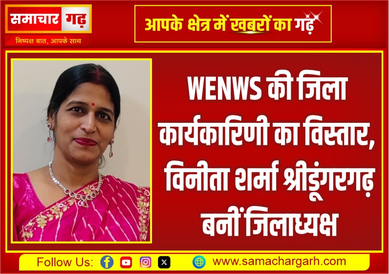 समाचार गढ़, श्रीडूंगरगढ़। महिला सशक्तिकरण और समाज कल्याण के क्षेत्र में सक्रिय राष्ट्रीय संगठन WOMEN’S EMPOWERMENT AND WELFARE SOCIETY (WENWS) द्वारा संगठनात्मक विस्तार की कड़ी में श्रीडूंगरगढ़ जिला कार्यकारिणी का गठन किया गया है। समाज सेवा के क्षेत्र में निरंतर सक्रिय भूमिका को देखते हुए विनीता शर्मा श्रीडूंगरगढ़ को जिला अध्यक्ष (बीकानेर) नियुक्त किया गया है।