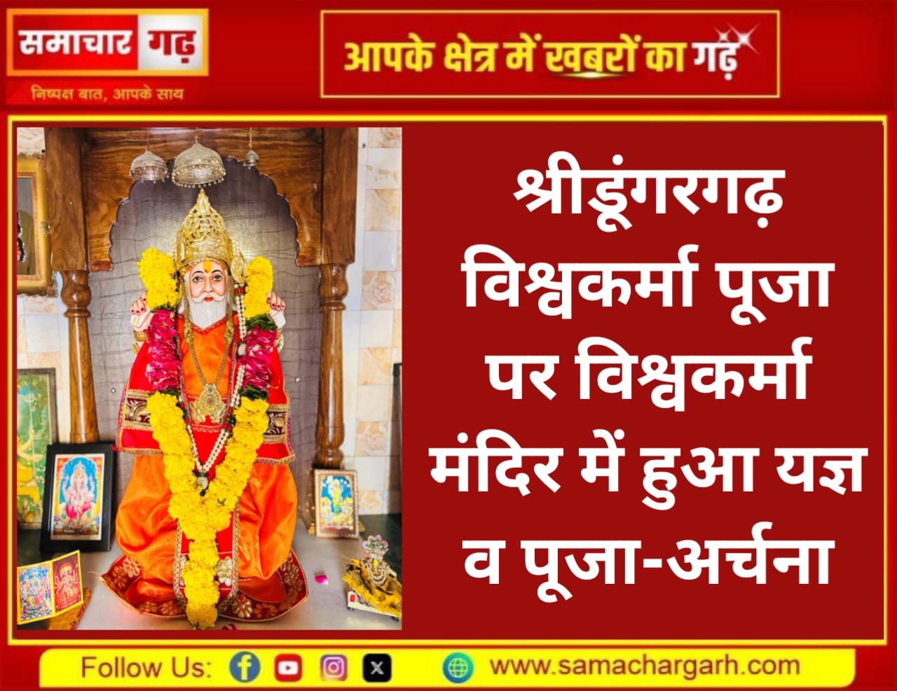 समाचार गढ़ 17 सितंबर 2025 श्री विश्वकर्मा पूजा के उपलक्ष्य में कस्बे के श्रीडूंगरगढ़ विश्वकर्मा मंदिर भवन को फूलों से सजाकर सजावट की गई। पूर्व संध्या को भव्य आरती का आयोजन हुआ तथा बुधवार सुबह भगवान विश्वकर्मा महाराज का यज्ञ किया गया। यज्ञ में जोड़े से घनश्याम सुथार-अनुराधा व बीरबल सुथार-जसोदा विराजमान हुए।